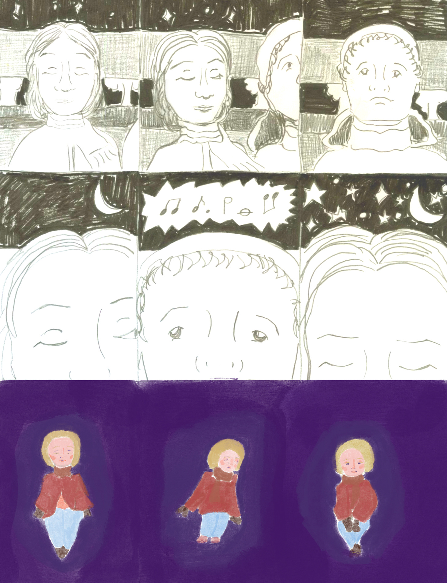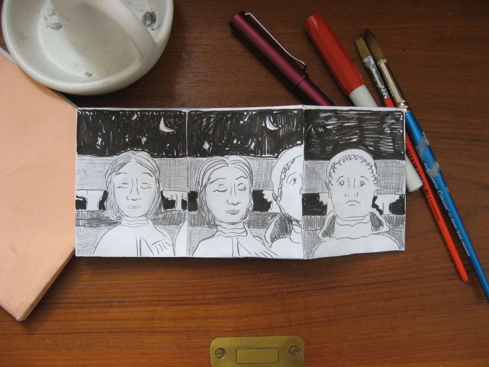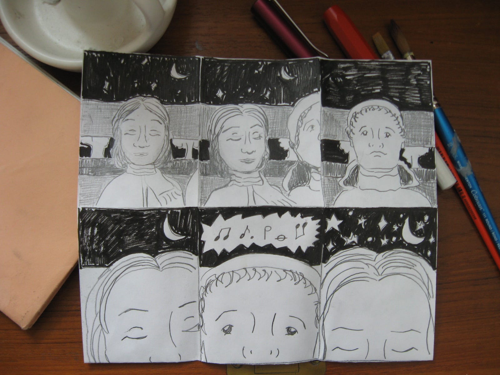 I walked the streets by my campus listening to these songs during my own Dark Night of the Soul this Spring. At the time, one of my lifelines was this course I was taking on comics. It was drawing for writers, and as I am a visual artist and a writer, the course was right up my alley. Furthermore, as a self-taught visual artist, the instructor’s emphasis on connecting with the practice through story rather than technique resonated with me deeply. I always struggle to make my images do something, just as I struggle to make my fictional characters do something. Signification has no weight without action.