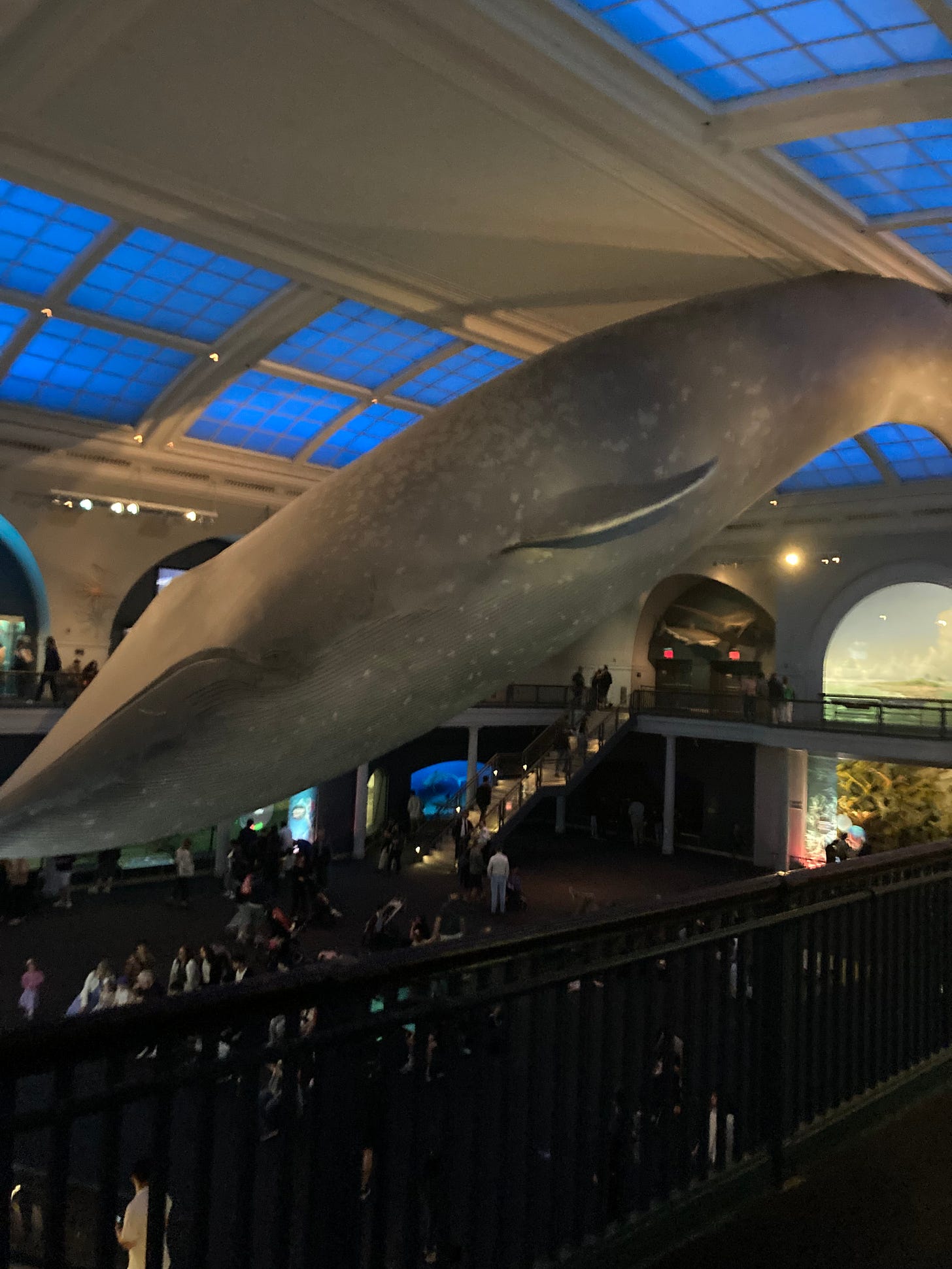 I think to call it a hallway doesn’t do this exhibit injustice. It’s a whole wing dedicated to all kinds and varieties of life on Earth. Floating in the center of the two floors is, what at least appeared to me at the time, a sperm whale. Life sized. Or, at least, close-to. When you are at either end of the replica, you can almost touch its nuzzle and its tale. When you are looking at it from above, it is as if a storm cloud has eclipsed the dim sun.